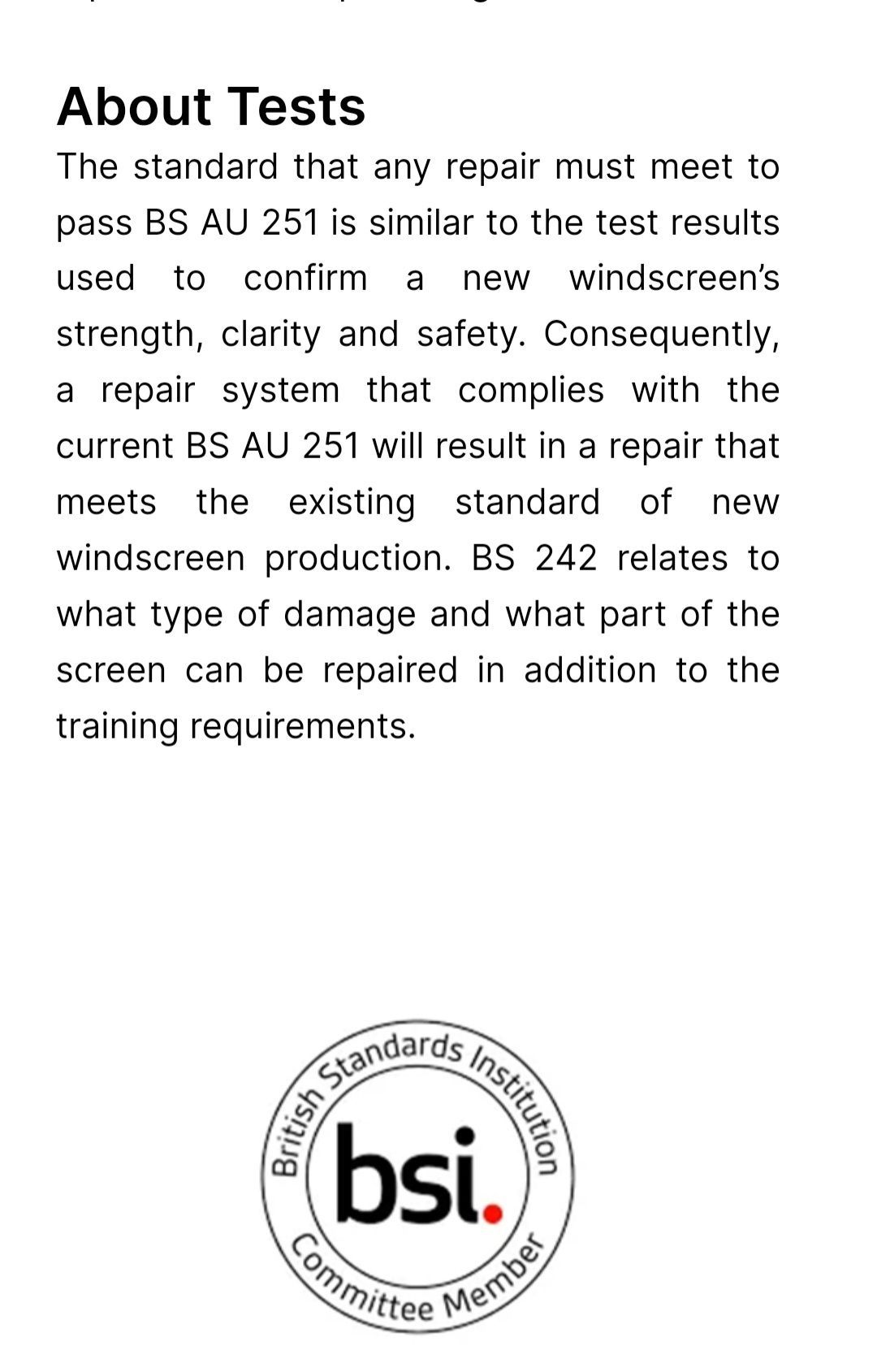 After a years transition from the run down of BS AU 242A:1998 starting on the 31/3/22 the new windscreen repair standard BS AU 242B:2022 became the only standard in the UK to work to on 31/03/23 if you claim to be compliant to British Standards. The industry at a glance seems to be carrying on "as they were". Numerous websites still claim to work to BS AU 242B:1998 and other websites think that by adopting the new "repair zones only" makes them compliant to work to BS AU 242B:2022. Its a simple adjustment. Working to 2022 British Standards is voluntary. However saying you are something your are not is an unsafe practice in 2023. The unassuming general public could needlessly end up having a windscreen replacement through a sub standard windscreen repair not being carried out to new British Standards. We will keep watching so that 4M registered companies who are compliant can be congratulated on their continued drive of excellence and hope that the rest of the industry keep up with the requirements of the insurance industry.